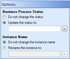 Options property box allows you to define how the Update Business Process activity will update the business process's statues and instance name.