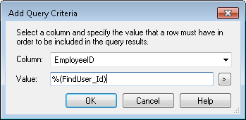 - In the Edit Query Criteria dialog box, modify the search value. Click the Token button (right arrow)
