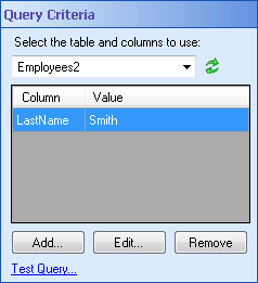 This property box determines which table the Query Data activity will search and which row's values the activity will return as tokens. This activity will return the values of the first row it finds as tokens. It also will return the collection of rows that have the specified column values.