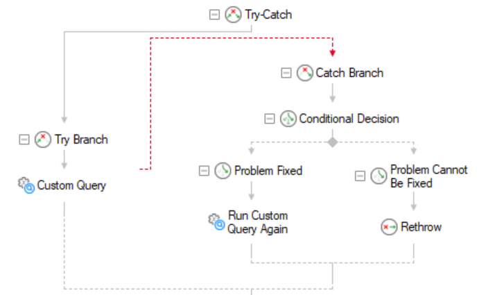 Example: Sally puts a Custom Query activity that she suspects will encounter an error in the try branch of a Try-Catch activity. If the Custom Query activity encounters an error, Sally wants IT team notified. If they can fix the problem, she wants the workflow to continue, but if they cannot fix the problem she wants to recreate the original error so the workflow terminates. She puts a Route Entry to Group activity in the catch branch that notifies IT and waits for them to set a field to say if they have fixed the database problem. If IT fixes the problem, a Conditional Decision activity runs the custom query again and the workflow continues. If IT cannot fix the problem, the Conditional Decision activity rethrows the original error, terminating the workflow.