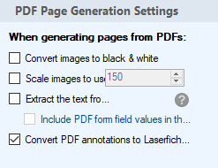 - Convert PDF annotations to Laserfiche annotations: Any PDF annotations on the retrieved PDFs will be converted into Laserfiche annotations.