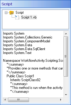 Note: Each workflow definition that has a script activity maintains two projects, one for VB and one for C#, that contain common code and a list of external reference assemblies that the activities can use. Each activity adds one or more code files to one of the scripting projects, and when the workflow definition is published, the two projects are compiled into separate assemblies.