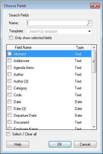 - Optional: Select or clear all fields by choosing Select/Clear all at the bottom of the dialog box.
