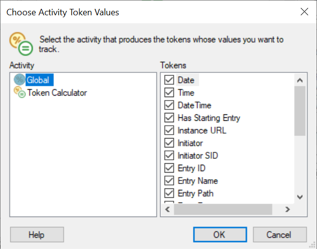Choose Activity Token Values dialog box and choose multiple tokens at once. Click OK to save your selection. - If you have chosen to track multiple tokens, you can click the X next to any tokens you do not want to track.