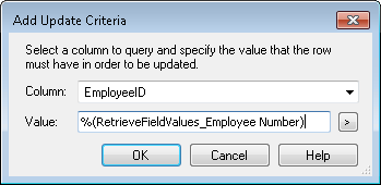 - In the Edit Update Criteria dialog box, modify in the value a row must have in order to update that row. Click the Token button (right arrow)