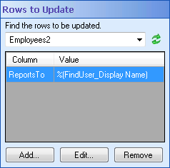 - Click Add in the Rows to Update property box to find the row(s) you want to update.