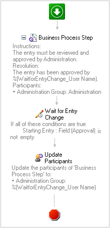 Example: During an approval step in Sue's business process, a member of the Administration Group must review and approve the entry being processed. Sue does not know who will complete the task, but she wants the reporting to show who the participant was. To do this, she adds a Wait for Entry Change activity inside her Business Process Step activity and configures its wait condition so that it waits for the Approval field to be changed. Then, Sue adds the Update Participant activity and configures it to update the participant to the User Name Token, %(WaitforEntryChange_User Name), that is produced by the Wait for Entry Change activity.