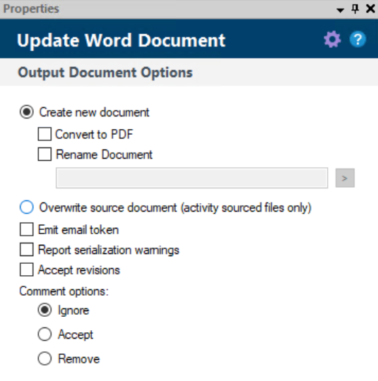 Advanced in the Properties Pane, select or clear the following options: - Create new document: Creates a new document that contains the changes made by the activity.