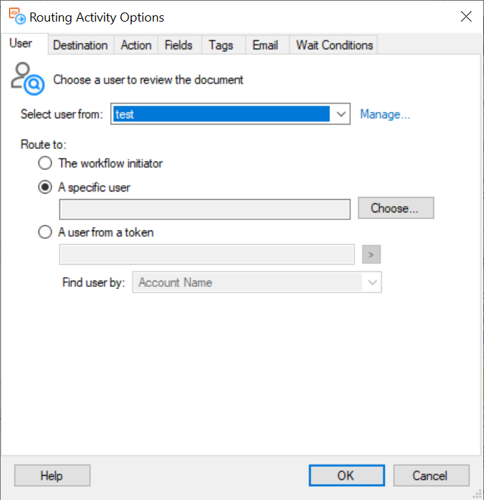required user icon to open the User tab of the Routing Activity Options dialog box. - Next to Select user from, select the Laserfiche, LDAP, or Laserfiche Directory Server trustee directory containing the desired user. Click Manage to open the Trustee Directory Manager to add or remove an LDAP or Laserfiche Server that provides user information to Workflow.