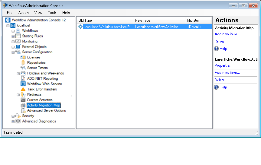 Tip: You can refresh this list to reflect recent changes by clicking the Refresh link below Activity Migration Map in the Actions Pane. Alternatively, right-click the Activity Migration Map node and select Refresh.