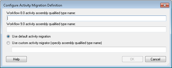 - Use custom activity migrator (specify assembly qualified type name): If the xml serialization of the activity has changed, or if you want to change the xml serialization. Enter the assembly qualified type name of the migrator in the text box below this option.
