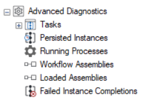The Advanced Diagnostics node of the Workflow Administration Console lets you view tasks, persisted instances, running processes, and assemblies for advanced troubleshooting.