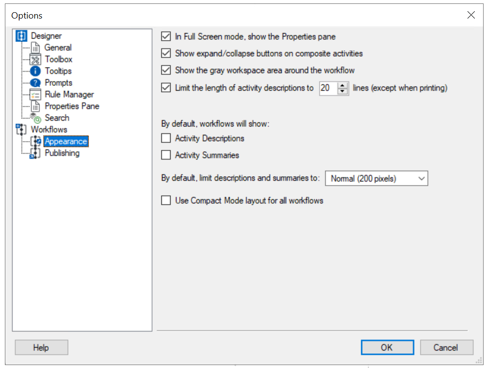 The Appearance node of the Options dialog box lets you to configure settings associated with the Workflow Designer's appearance.