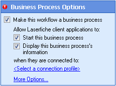 - Configure a connection profile in the Business Process Options property box. Note that, if your business process will not be viewed from or started in the Laserfiche client applications, as configured in the Business Process Options property box, a connection profile is not required.