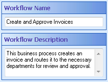 from the toolbar to open a new Designer Pane. Alternatively, use the keyboard shortcut CTRL+N. - In the Properties Pane, name and describe the business process in the Workflow Name and Workflow Description property boxes. Learn more about the Workflow Name or Workflow Description property boxes.