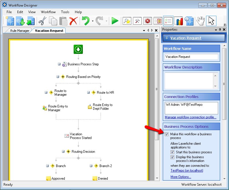 - The connection profile, selected in the Business Process Options property box, defines the Laserfiche Server, repository, and the user name that Workflow will use when interacting with the repository. Additionally, the business process connection profile specifies which repository the business process can be started from and where its reporting details can be seen.