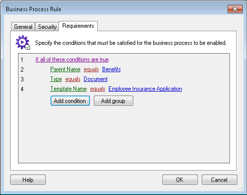 This dialog box lets you define a rule that specifies when a business process will be enabled in the Laserfiche client applications. Users in the Laserfiche client applications will only be allowed to start the business process if the rule is satisfied.