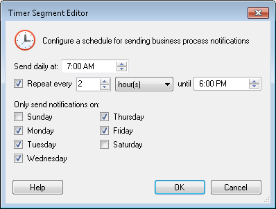 Example: Gawain wants notifications to be sent to his business process participants during weekdays and only during working hours. During working hours, Gawain wants notifications to be sent at an interval of once every two hours.