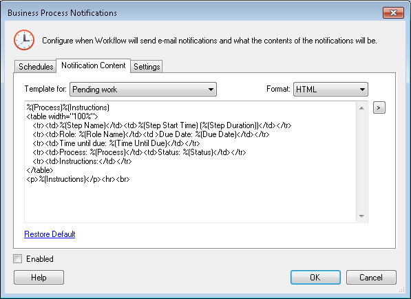 Each template corresponds to the notification options selected in the Role Editor. Templates are pre-configured to include tokens whose values will be filled when the business process instance runs. However, you may edit the template from the text box if appropriate. To reset the notification template to its default, click the Restore Default link. To use tokens (learn about business process tokens), click the Token button (right arrow)