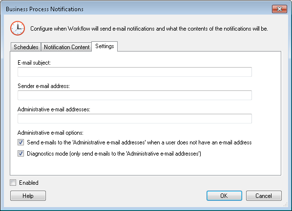- Diagnostics mode: Send all notification e-mails to the administrative e-mail addresses. This option allows you to test your business process notification system before making it live.