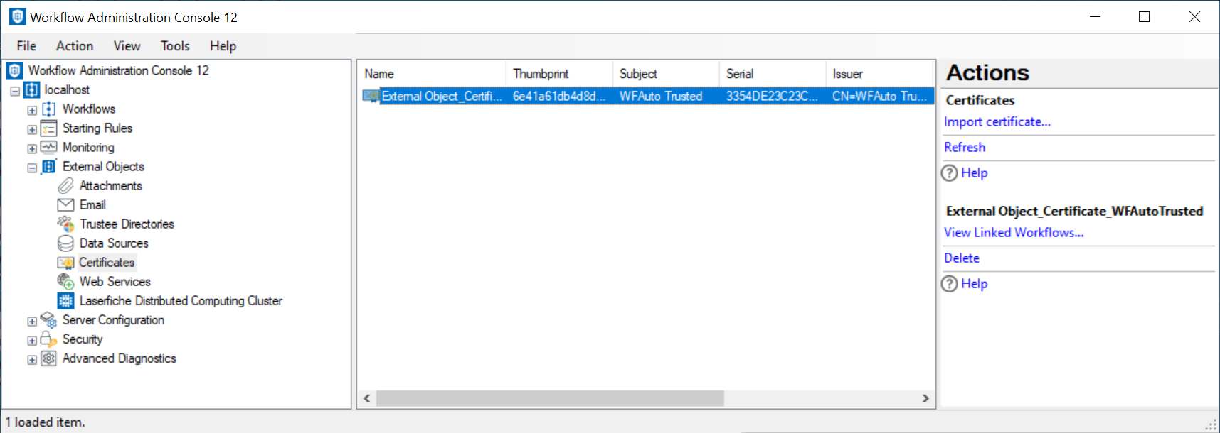 This node, under External Objects in the Workflow Administration Console, allows you to import and remove digital signature certificates. This node displays certificates' thumbprints, subjects, serial numbers, issuers, and algorithms. It also shows the dates and times between which certificates are valid.