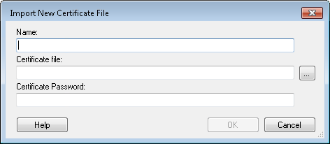 Import new certificate file dialog box, type a name for your certificate under Name. - Under Certificate file, type in the full folder path (including the name of the .pfx file) for your certificate or click the Browse button