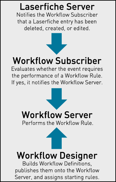 - Workflow Subscriber: This component acts as a link between the Workflow Server and the Laserfiche Server. The Workflow Subscriber receives notification from a Laserfiche Server when a change is made to a Laserfiche entry. It evaluates the event to determine if a starting rule or wait condition is satisfied. If so, the Workflow Subscriber notifies the Workflow Server.