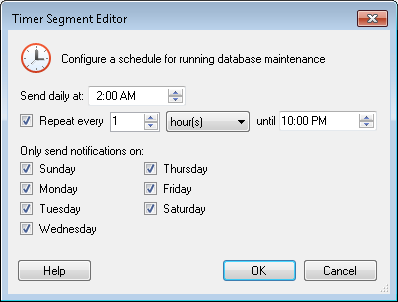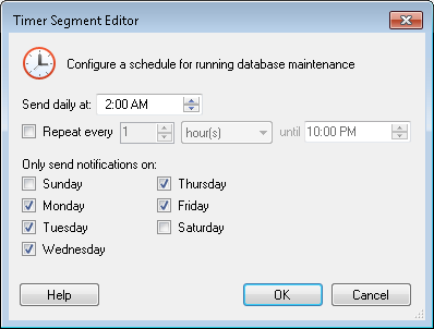 Timer Segment Editor dialog box, specify the time of day the timer should start maintenance. Then, define the frequency that maintenance will occur by configuring the Repeat every ___ option. Determine which days of the week maintenance will run by selecting their corresponding checkboxes. Click OK when finished. - Optional: Select Exclude holidays and weekends from all schedules to prevent database maintenance from running during Holidays and Weekends.