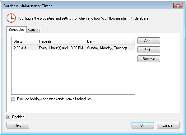 enable or disable the timer by selecting or clearing Enabled (located at the bottom of the dialog box). If you disable the timer, no database maintenance will occur.