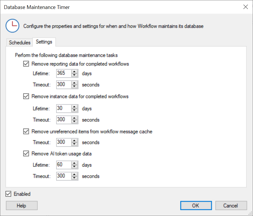 Settings tab, configure which tasks the Database Maintenance Timer will perform: - Remove reporting data for completed workflows: This option deletes reporting data associated with completed workflow instances after a specified period of time. Any data older than the Lifetime specified will not be available to new Workflow Statistics Reports and business process details.