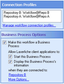 Note: Business process reporting can only appear in a single repository, and the business process can only be started from the repository defined in the business process connection profile.