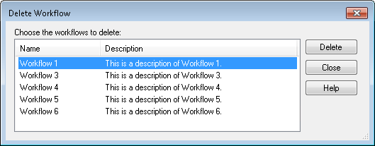 Delete Workflow dialog box, select one or more workflows to delete. (Hold down CTRL to select more than one workflow at once.) - Click Delete, or press DELETE on your keyboard.