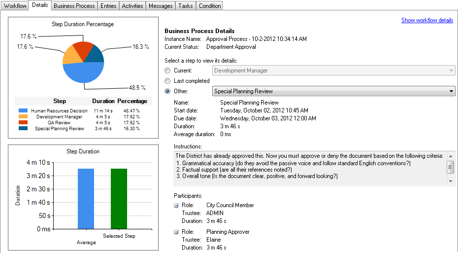 - The step details show the step's name, its start and end date (if applicable), the due date for the step (if applicable), the duration, and the average duration of the step across all business process instances.