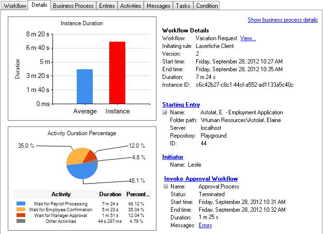 - The Activity Duration Percentage chart shows how long it took each individual activity took to complete and visually shows how long each activity took measured as a percent of the total instance time.