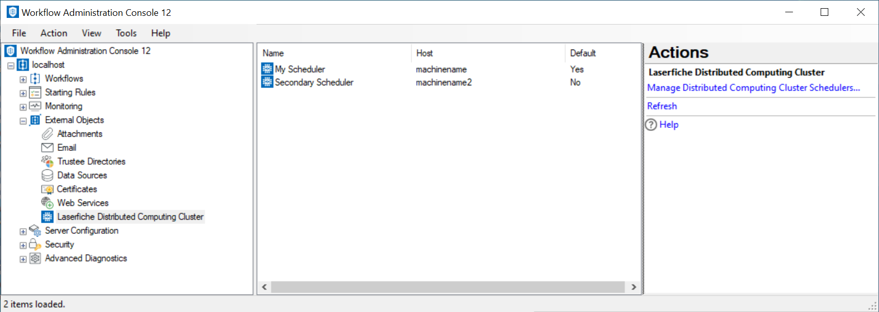 This node, under External Objects in the Workflow Administration Console, lets you view the Distributed Computing Cluster Schedulers that are configured to work with workflows on the Workflow Server. You can add, modify, and delete schedulers from this node. Learn more about Laserfiche Distributed Computing.