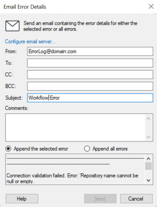 to open the E-mail Error Details dialog box. - Click the Configure E-mail Server link at the top of the dialog box to enter a SMTP Server and port.