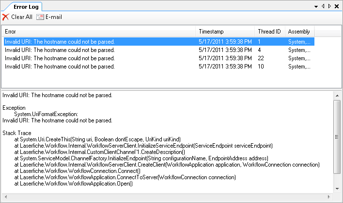 This pane lists any errors you encounter while building and/or publishing workflow definitions. You can e-mail errors to your administrator or technical support from this pane.