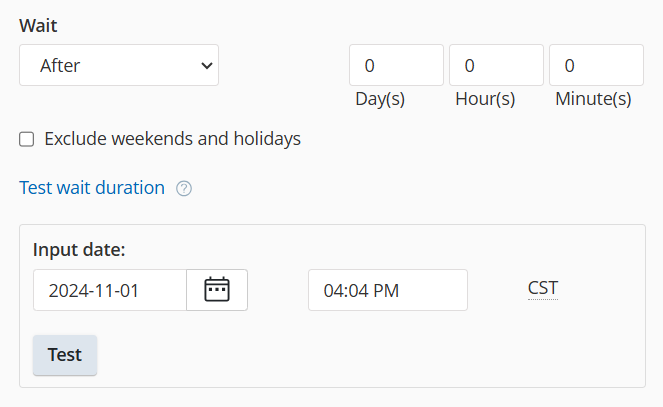 - Select After to specify a specific amount of time you want the process to be delayed, after which the next step will begin. You can also Exclude weekends and holidays from the amount of time.