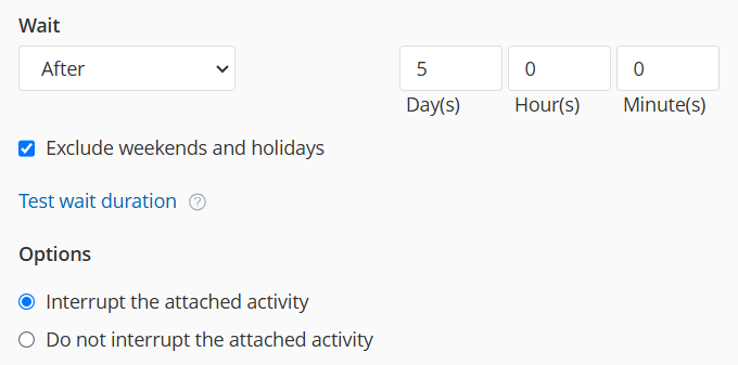 - Select After to specify a specific amount of time you want the process to be delayed. You can also Exclude weekends and holidays from the amount of time.