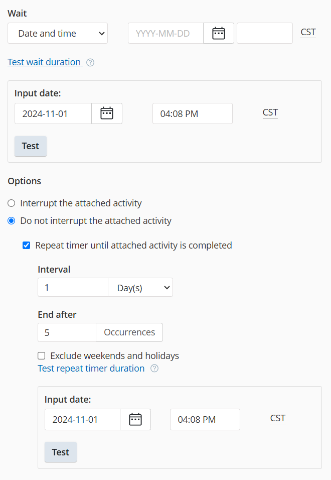- Specify the wait conditions under Wait. You can delay the process based on the following options: