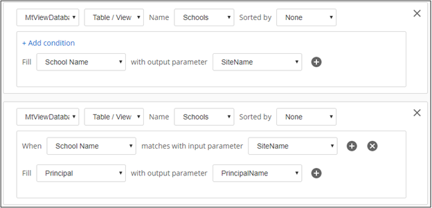 - In the drop-down list next to When, select the form field that should match a column in the table in the database. Specify the data source column in the data source column drop-down. Click the plus sign to add a condition or x to remove a condition.
