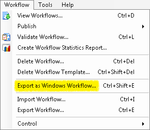 Workflow in the main menu. Alternatively, use the keyboard shortcut CTRL+SHIFT+E. - In the Select Export Location dialog box, name the C# Source Code file.