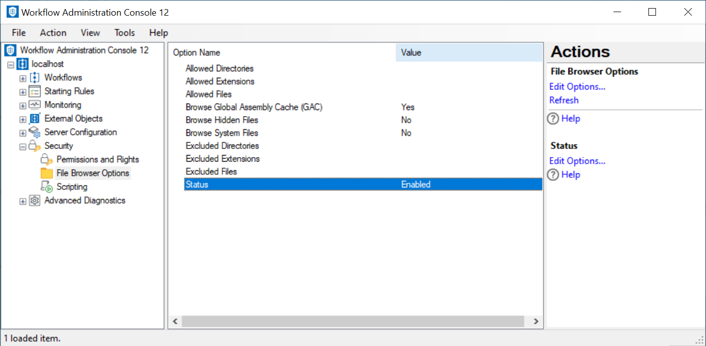 The File Browser node, under Security in the Workflow Administration Console, lets you configure whether Workflow users and activities are allowed to browse the Workflow Server's file system. You can specify which directories, files, and extensions are allowed or excluded.