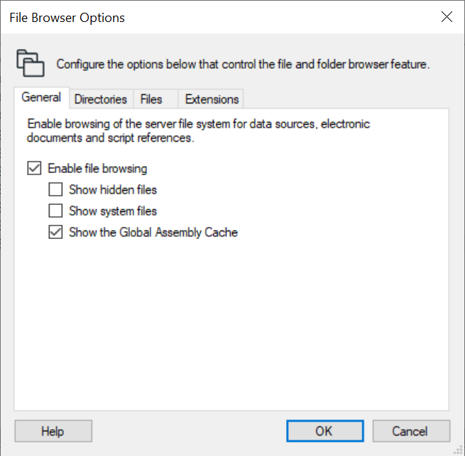 - Optional: If you enable file browsing, you can choose to show or hide hidden files, system files, and the Global Assembly Cache.