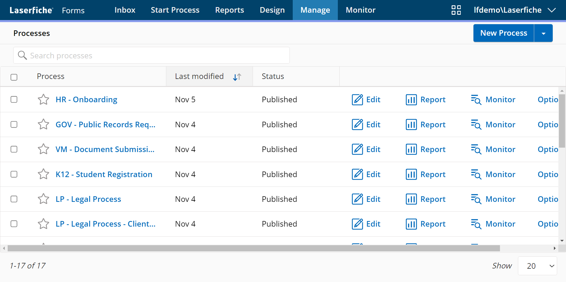 The Manage page lets you view a process depending on your access rights and system security role for the process. For example, to create and import business processes, you must be assigned the Creator role on the System Security page. To administer business processes, you must be assigned the Process administrator or Business Manager role for that specific business process. When you create a business process, you are assigned the Process administrator role for that process.