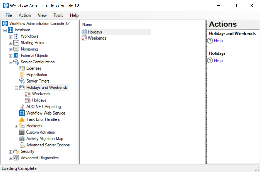 The Holidays and Weekends node, under Server Configuration in the Workflow Administration Console, lets you define weekends and holidays. These days will be taken into consideration by the Exclude weekends and holidays option in the Route Entry to Folder, Route Entry to Group, Route Entry to User, Deadline, Escalation, and Delay activities.