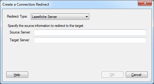 Create a Connection Redirect dialog box, use the Redirect Type drop-down list to select the type of redirect. Select Laserfiche Server when there is only a server name change. Select Laserfiche Server and Repository if there are changes to both the Laserfiche Server name and repository name. - Next to Source Server, specify the Laserfiche Server you are creating a redirect for.
