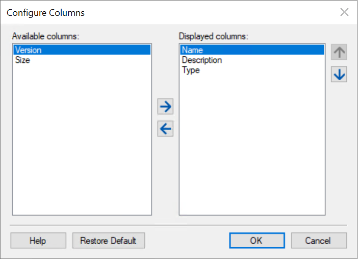 - In the Configuring Columns dialog box, select a column name in the Displayed columns section.