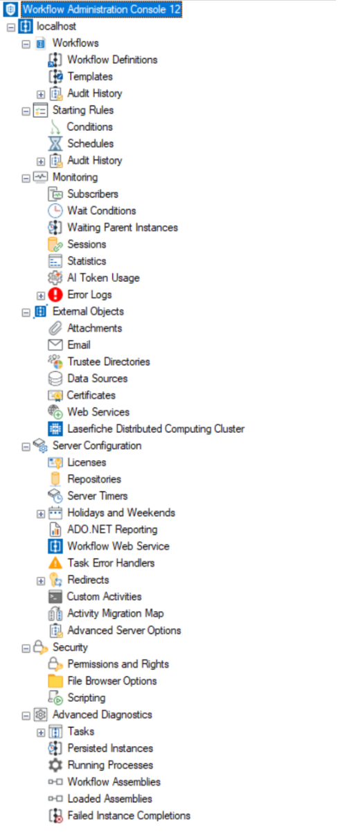 Tools: This node contains the Manage Business Process Instances option, which allows you to delete or dissociate business process instances from entries in the Laserfiche client applications.