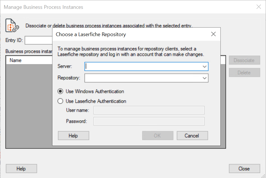 This dialog box allows business process instances to be either dissociated from a specific entry or completely deleted from the Laserfiche repository.